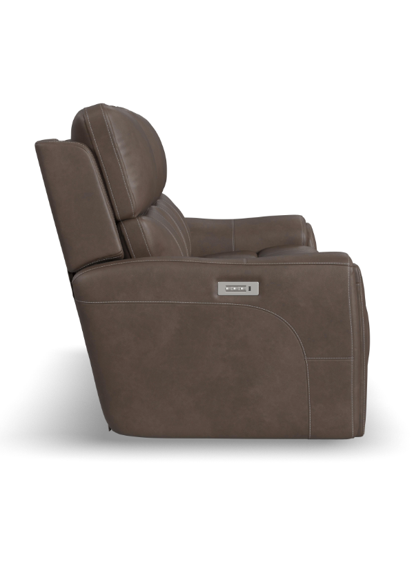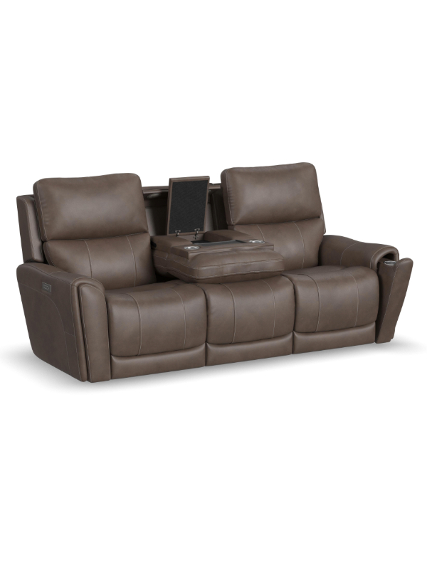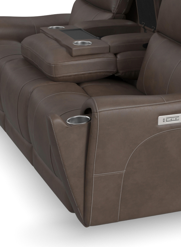 The Flexsteel Carter Power Reclining Sofa offers a blend of modern design and advanced comfort features. Upholstered in a durable, easy-to-clean fabric that mimics the luxurious feel of leather, it’s available in cappuccino brown and smoke gray colors. The sofa features flared, pad-over arms with discreet pop-out cupholders, contoured seats with waterfall chaises, and heavy thread stitching for a striking appearance. Each end seat is equipped with power controls that independently adjust the recline, headrest, and lumbar support, allowing for a personalized seating experience. The Zero Gravity recline function reduces pressure and imparts a feeling of weightlessness. A flip-down center back cushion reveals a storage console with touch lighting and a wireless charging pad. Built with Flexsteel’s patented Blue Steel Spring™ seat system, the Carter sofa ensures unmatched support and durability.
