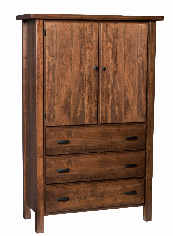 The Sawyer Collection from the Meyers Amish Furniture line brings together rustic simplicity and lasting craftsmanship in a beautifully cohesive bedroom suite. The Sawyer Bed features bold panel details and clean lines, handcrafted from solid wood by skilled Amish artisans. The coordinating dresser and armoire continue the collection’s signature style — with rich wood grain, durable construction, and sleek black hardware for a touch of modern contrast. Each piece can be customized in your choice of wood species and finish, making the Sawyer Collection a timeless foundation for any bedroom.